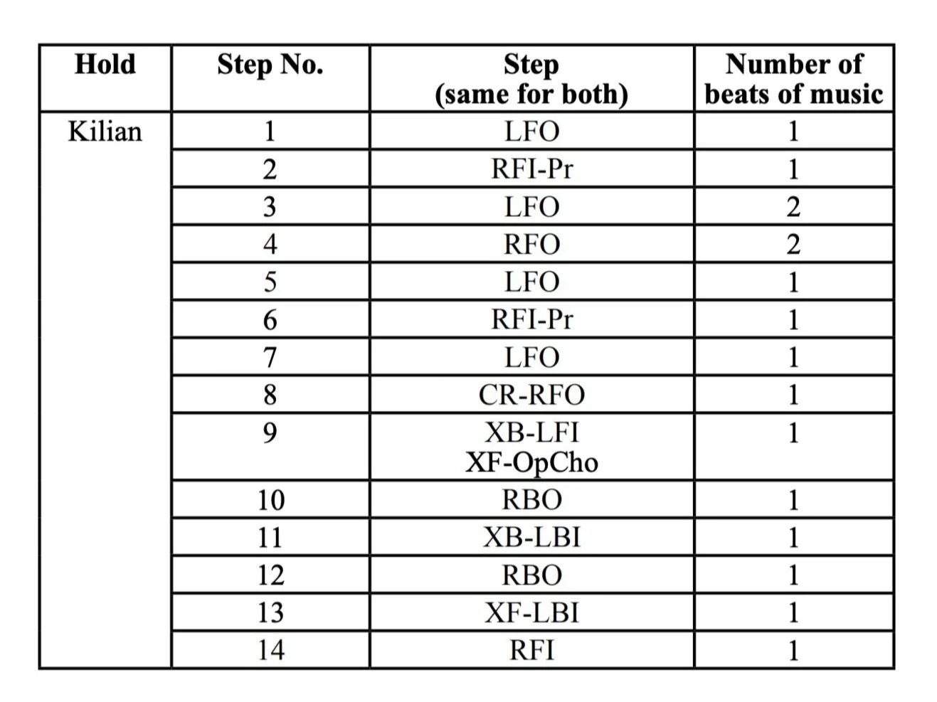 The Kilian is a test of close and accurate footwork, unison of rotation and control. Upright posture is required throughout. The dance follows a counterclockwise elliptical pattern, but the start and succeeding steps may be located anywhere around the circle. Once established, however, no shift of pattern is acceptable on subsequent sequences. The clockwise rotation must be controlled.